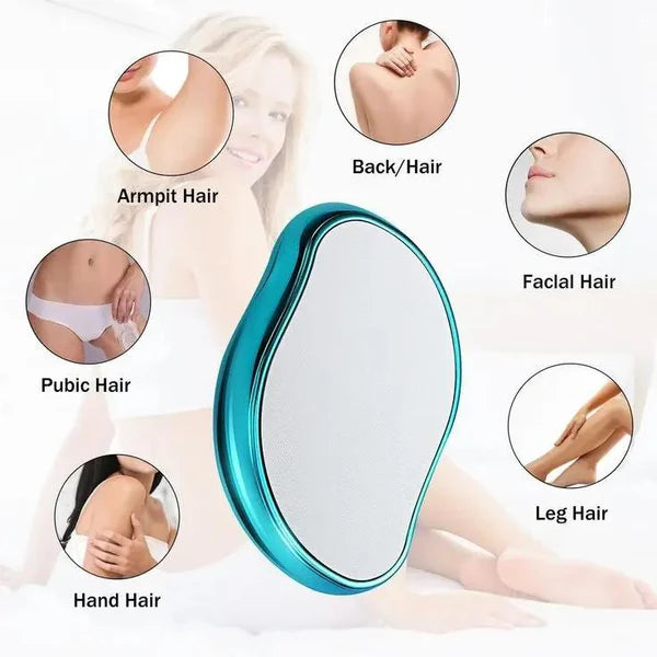 A reusable crystal/glass hair remover that gently buffs away fine hair and exfoliates skin with a painless rubbing motion. Compact, battery-free, and eco-friendly — great for quick touchups and smooth results without chemicals or razors.